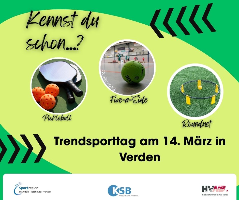 Schon mal was von Five-a-side oder Pickelball gehört? Wolltest du schon immer mal Roundnet spielen? Bei unserem kostenfreien Trendsporttag am 14. März in Verden kannst