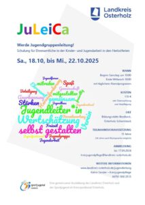 Auch in diesem Jahr findet wieder eine JuLeiCa-Basis-Schulung, der Kreisjugendpflege Osterholz und der Sportjugend im Kreissportbund Osterholz, in der Bildungsstätte Bredbeck statt.